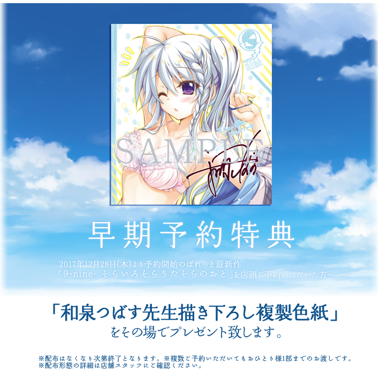 「9-nine-そらいろそらうたそらのおと」取扱店舗全店にてご予約いただけます。